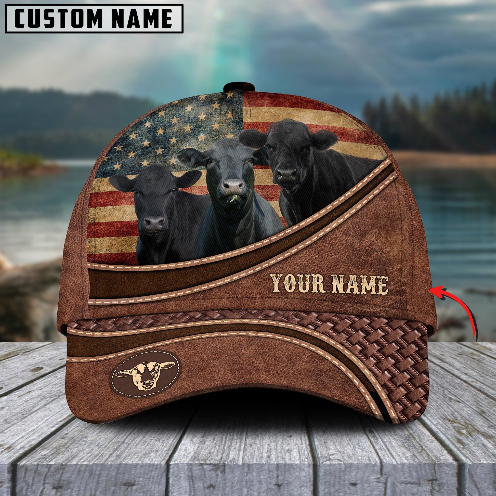 Gorustics Black Angus US Flag Personalized Name Brown Carving Leather Pattern 3D Classic Cap